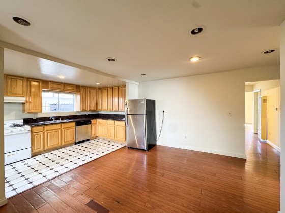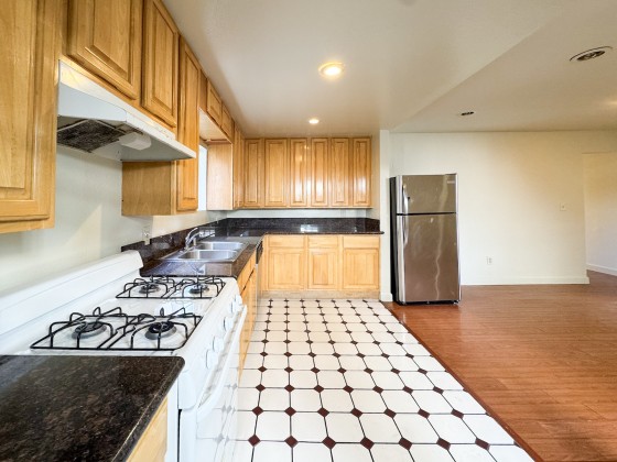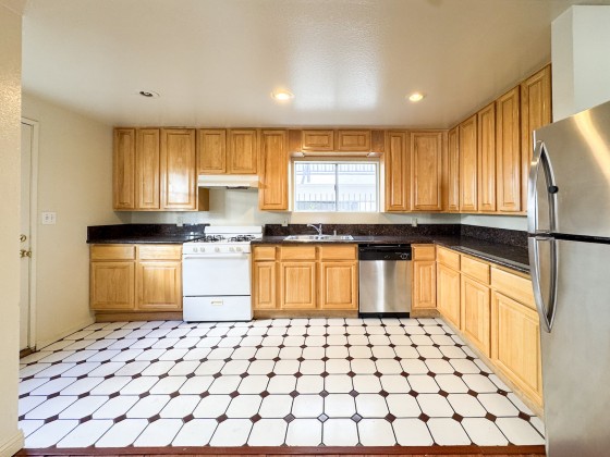 Inside, you’ll find a massive living room, four bedrooms, three full baths, great closet space, high ceilings, and wood floors throughout. The remodeled kitchen is spacious and bright with recessed lighting, newer tile floors, updated cabinets, a stove, and a stainless steel dishwasher. It’s so large you can easily fit an island and a dining table, with plenty of room left to cook and entertain.
